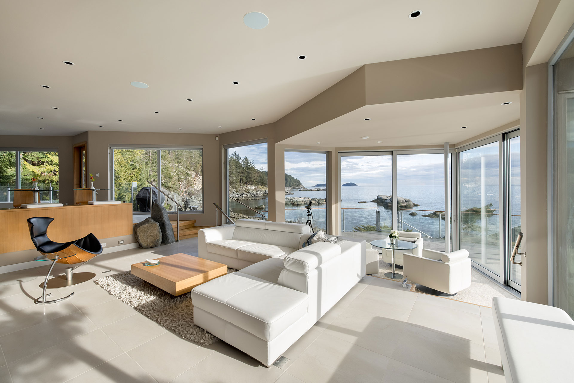 Views of both the sheltering treed shoreline, rocks and wild log strewn beach surround you from this corner suite. Enjoy bathtub sailing from the sleek double soaker tub or curl up by the fire to watch winter storms rolling in.