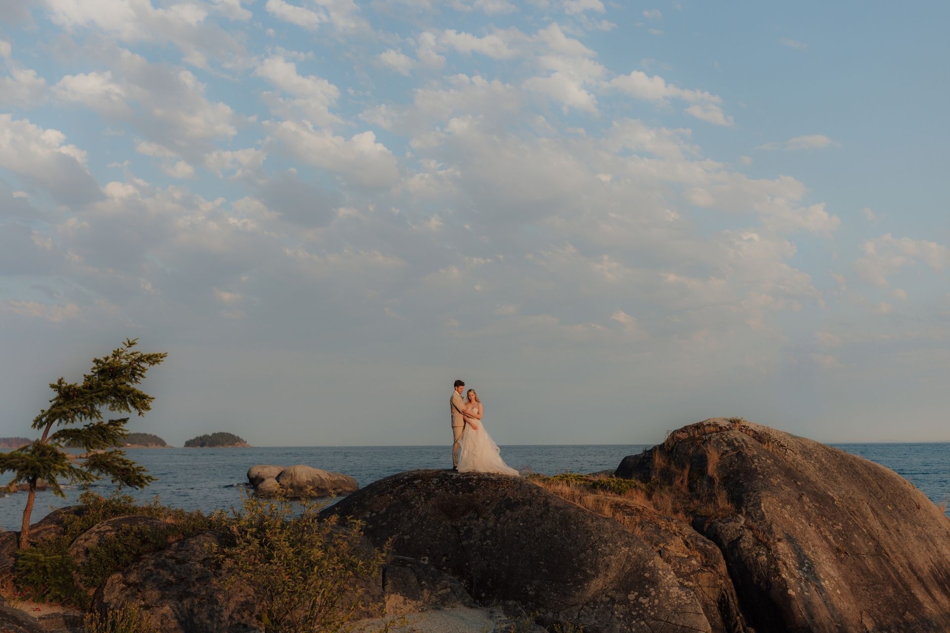 Begin with a private oceanside ceremony at the Pointhouse. As the day softens toward evening, step aboard our motor yacht Off Point for a quiet coastal passage through sheltered waters of Sargeant Bay and beyond.
